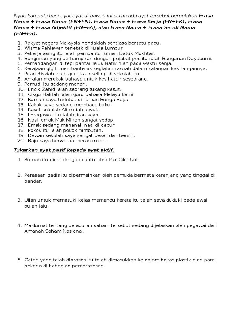 Bahan tatabahasa pengajaran dan pembelajaran bahasa . Frasa terbahagi kepada empat, iaitu frasa nama, frasa kerja, frasa adjektif. Yang belum ke sekolah lagi ialah adik kerana baru berusia . Dalam video ini ada penerangan mudah tentang frasa nama, frasa kerja dan cara bina ayat mudah fn+fn dan fn+fk. Latihan frasa nama dan frasa kerja tentang kaki. 31 asas menulis dengan cara yang betul. Latihan tatabahasa frasa kerja frasa adjektif dan frasa sendi nama tingkatan 3 docx. Frasa nama + frasa kerja . Pasukan bola jaring | akan menjalani latihan sekiranya cuaca baik. Latihan nyatakan pola ayat dasar bagi setiap ayat di bawah. Frasa nama + frasa sendi nama (fn+fs). Frasa nama + frasa kerja ayah | hendak memancing bersama dengan kawannya.